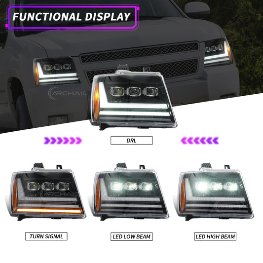 Phares entièrement à DEL pour Chevy Suburban 1500 (2007-2014), Suburban 2500 (2007-2013), Tahoe (2007-2014) et Avalanche (2007-2013).